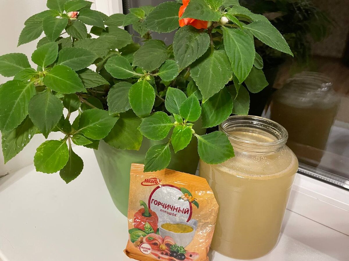 Первый метод — полив донной порцией настойки: одна столовая ложка горчичного порошка на литр тёплой воды, настой 24 часа, затем разбавление 1:3 и полив под корень. Важна редкость применения — не чаще раза в четыре недели, после которого не вносят другие удобрения две недели.