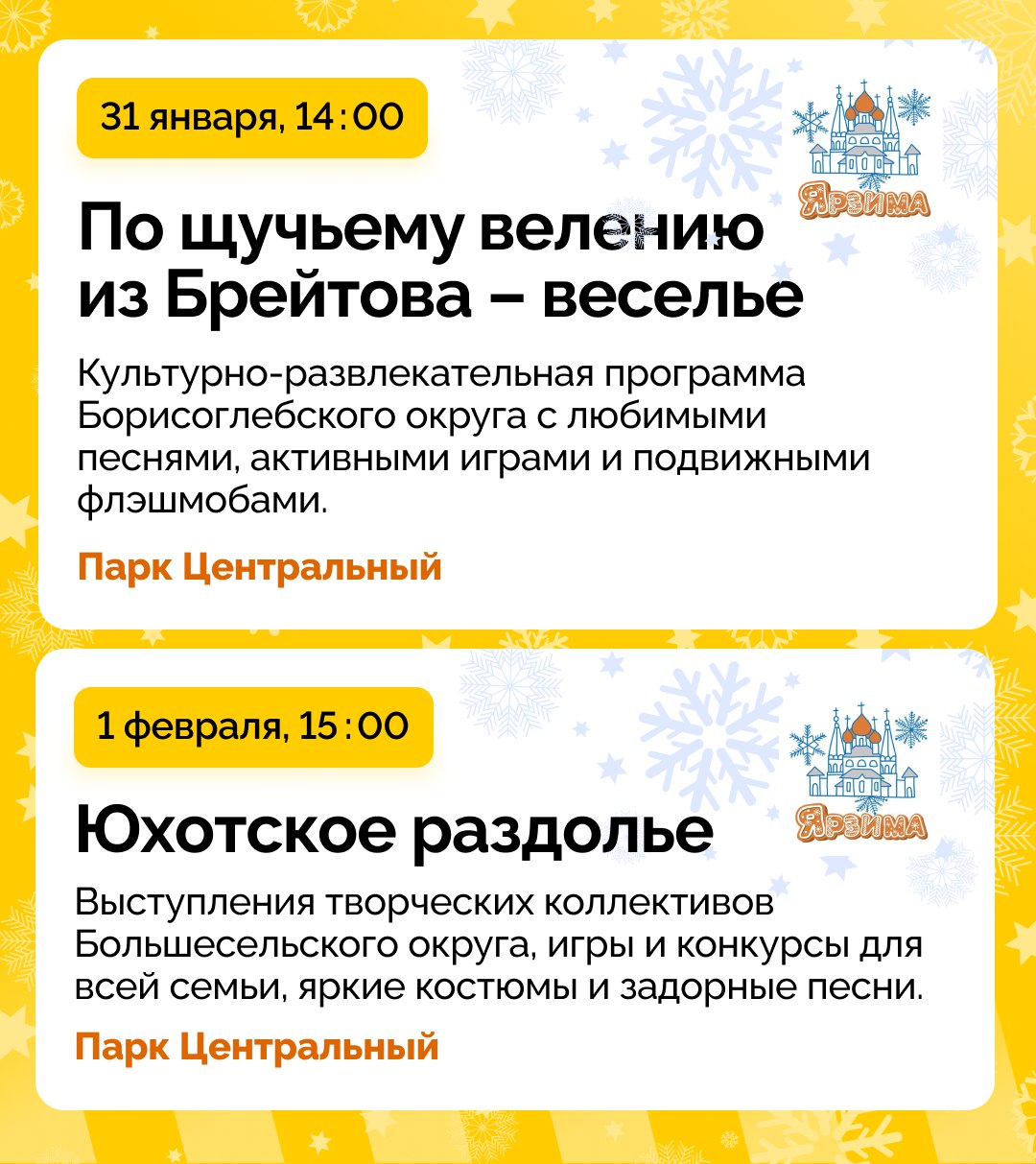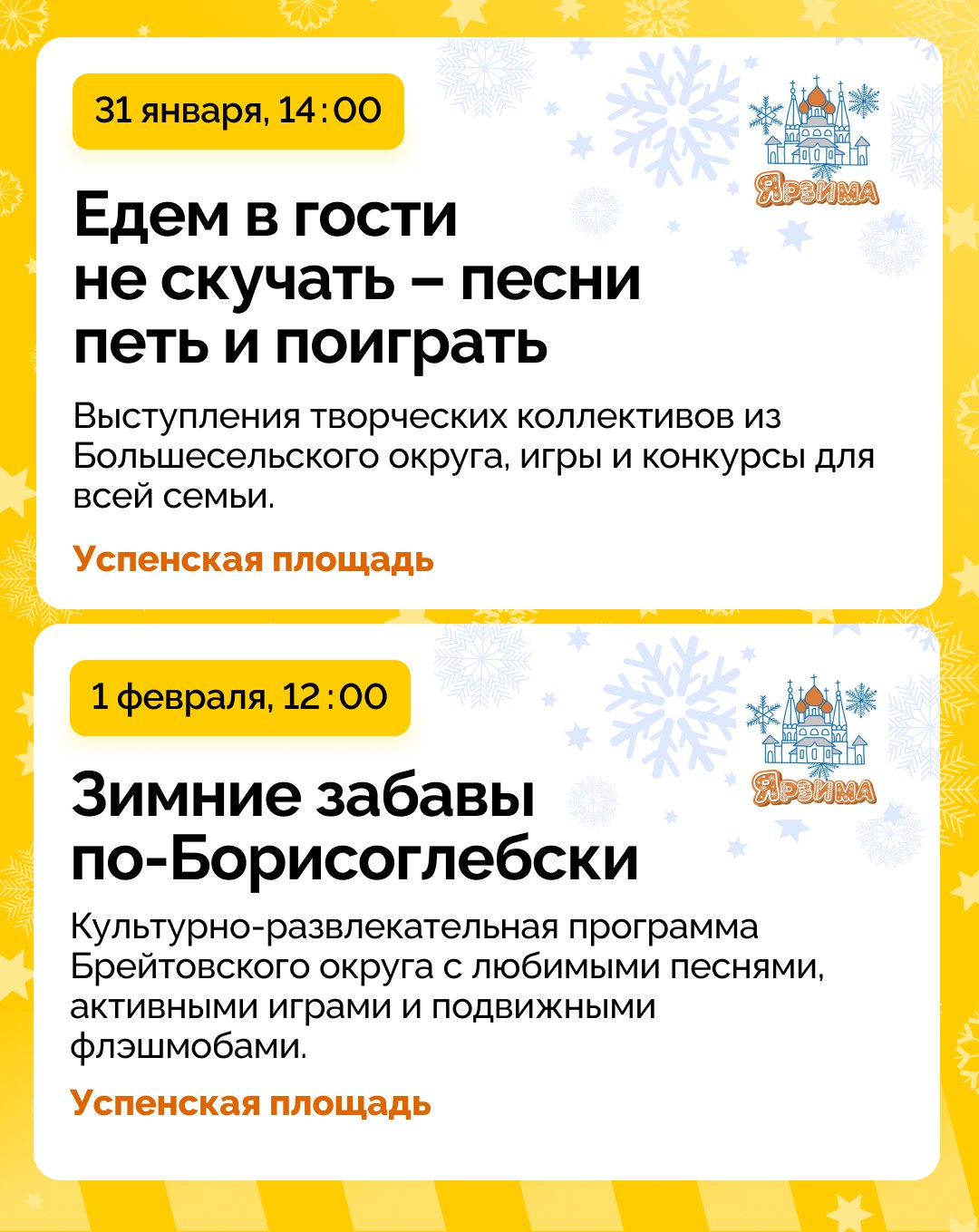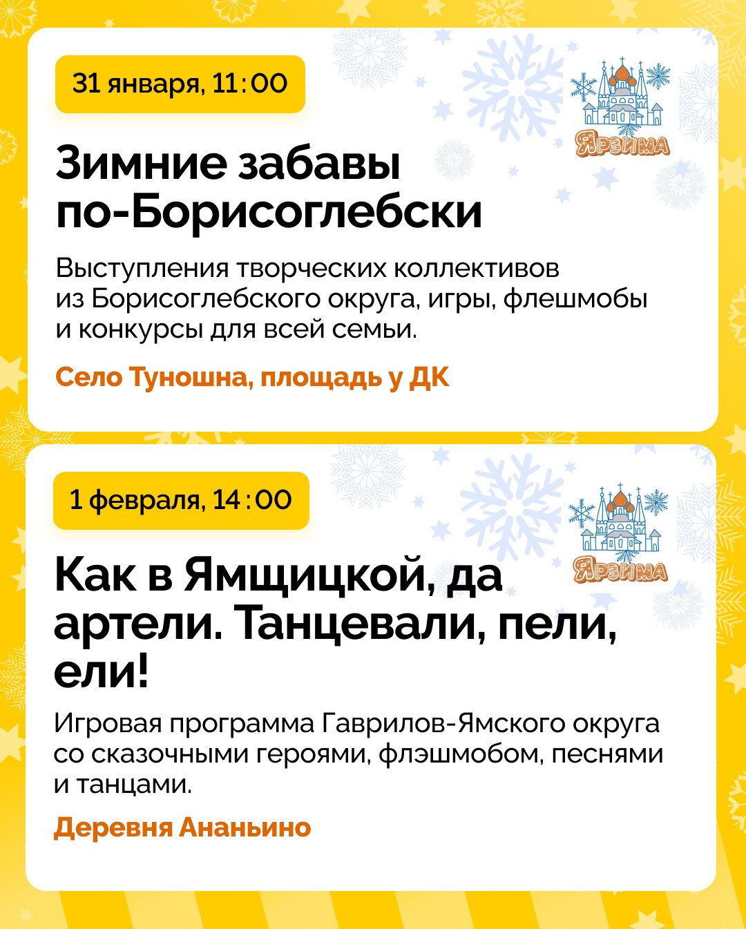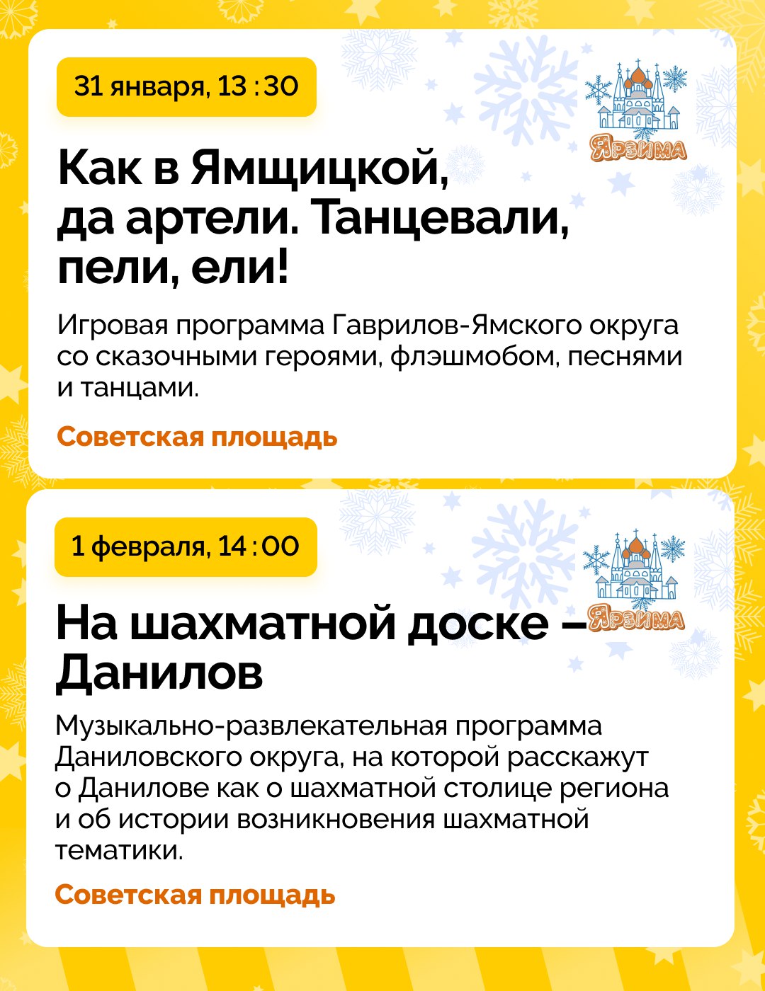 Фестиваль ЯрЗима проходит в разных округах области, в нем участвуют местные коллективы. Подробную программу можно посмотреть на портале правительства Ярославской области.