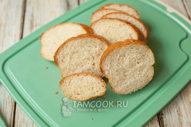Нарезать белый батон ломтиками толщиной 1,5–2 см (400 г).
