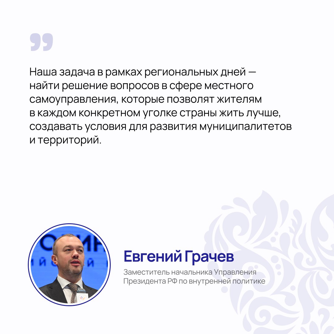 По словам замначальника Управления Президента РФ по внутренней политике Евгения Грачева, региональные дни создают возможности для новых решений в работе местного самоуправления. По окончании события участники «увозят» в свои муниципалитеты особенно полезные практики, которые почерпнули из общения с коллегами.