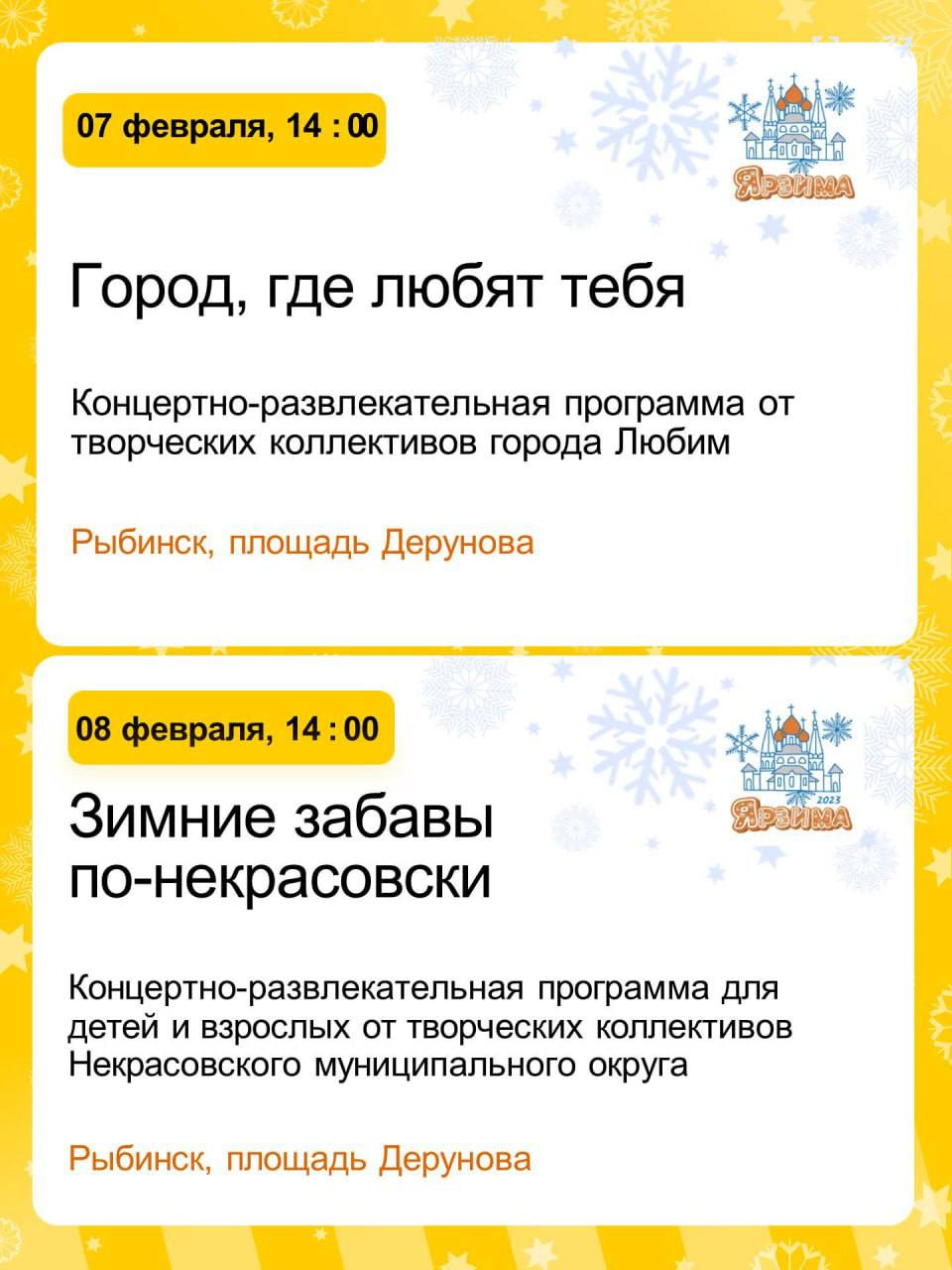 Проект проходит по инициативе губернатора Ярославской области Михаила Евраева. В субботу, 7 февраля, Любим порадует рыбинцев русскими народными играми, фантами, полонезом и барыней, цыганскими песнями. В воскресенье, 8 февраля, детей и взрослых ждут «Зимние забавы по- некрасовски».
