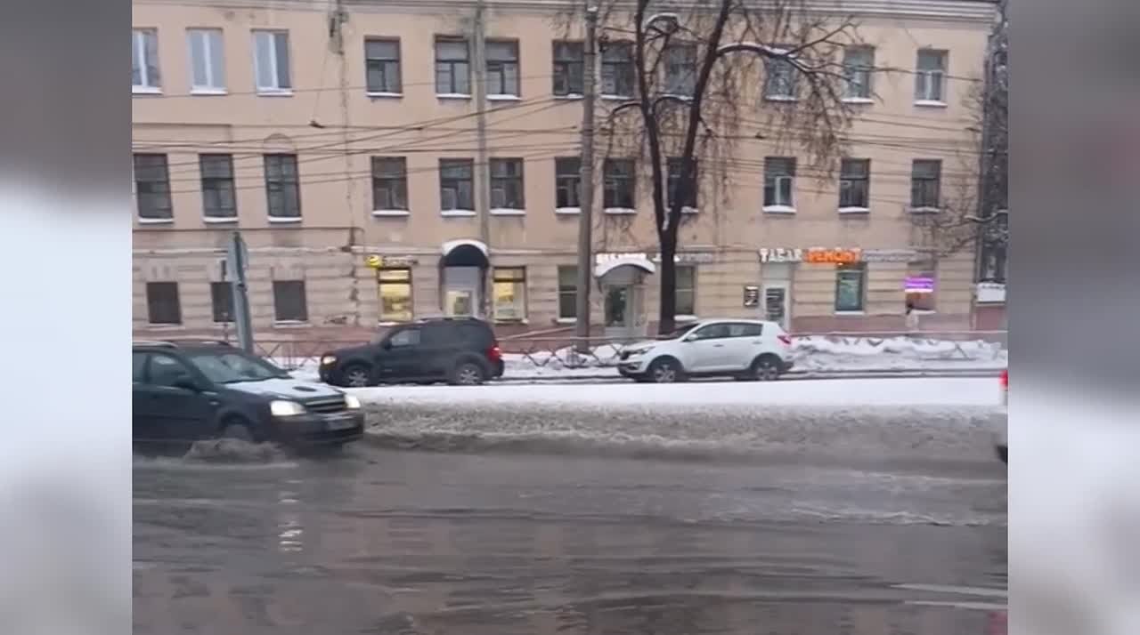 Потоп на Октябрьской площади в Ярославле. И нет, это не последствия потепления. Вода, по словам очевидцев, забила из люка.
