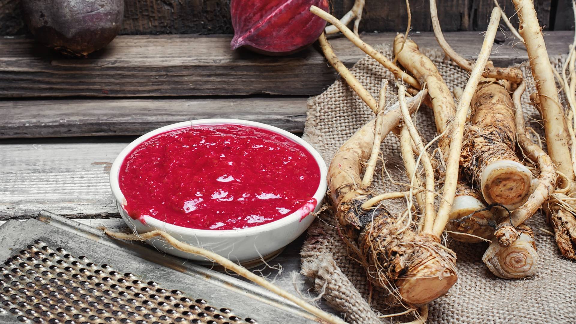 Тщательно вымойте корень хрена, очистите и нарежьте небольшими кусочками. Со свеклы снимите шкурку и разделите на несколько частей. Измельчите овощи с помощью блендера или мясорубки.