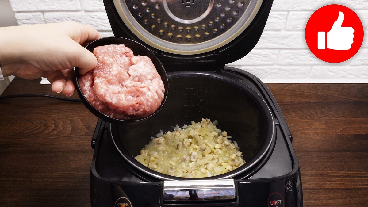 Включив мультиварку в режиме «жарка», на сковороду следует налить подсолнечное масло. Затем обжарить лук вместе с мелко нарезанными грибами около 5 минут до появления золотистой корочки. После этого добавляется мясной фарш, который обжаривается еще в течение 3 минут. На этом этапе стоит добавить плавленый сыр, специи и горячую воду, тщательно перемешав все ингредиенты.