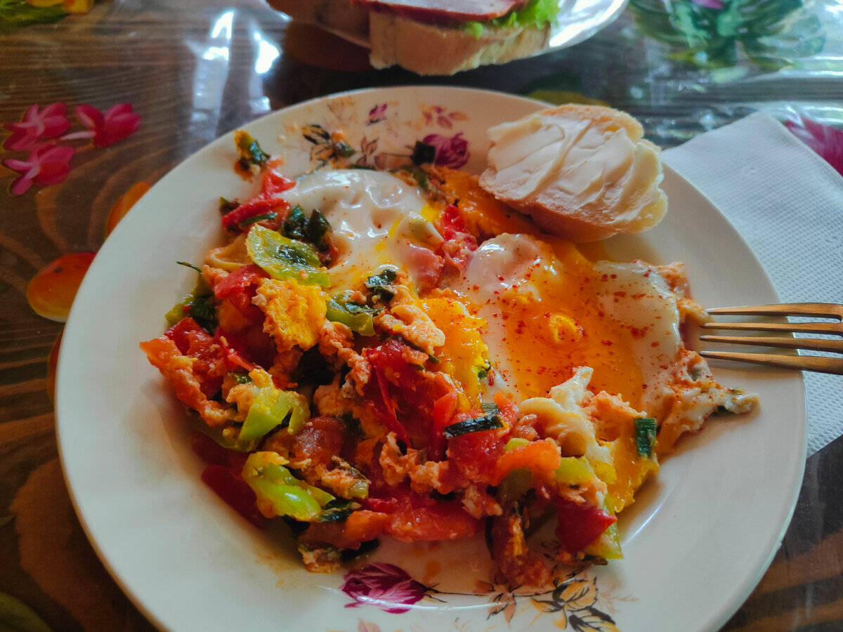 Начать утро можно с яичницы менемен — это яркое и насыщенное блюдо из яиц с овощами, а добавленный зеленый лук и молодые листья чеснока придадут ему особую свежесть. К этому отлично подойдут бутерброды с грудкой индейки. Вкусно и питательно!