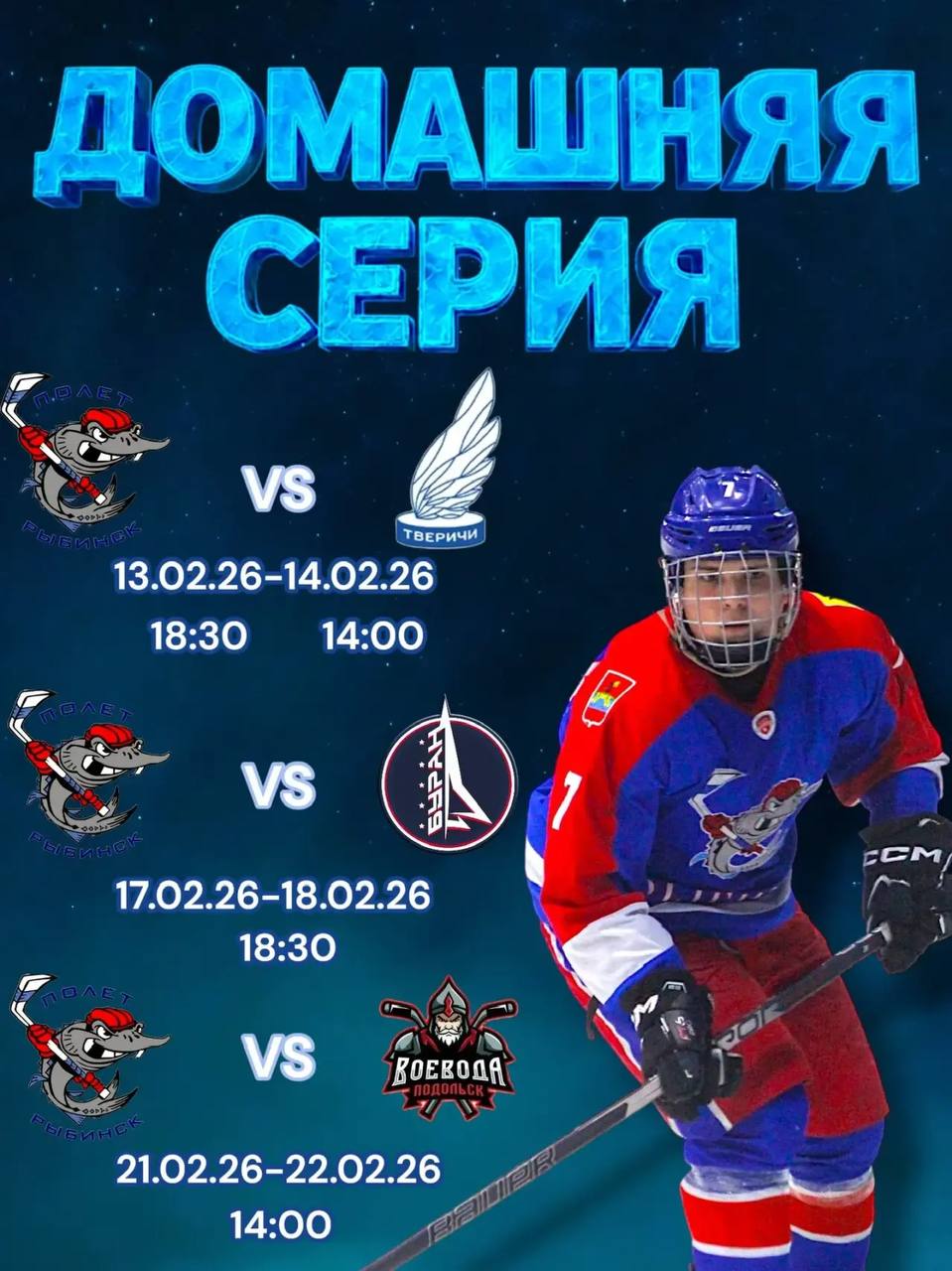 Сегодня и завтра играем с командой «Тверичи». 17 и 18 февраля — с московским «Бураном», 21 и 22 февраля — с подольским «Воеводой». Ребятам нужна поддержка болельщиков! Ждём всех на трибунах. Болеем за «Полет»!