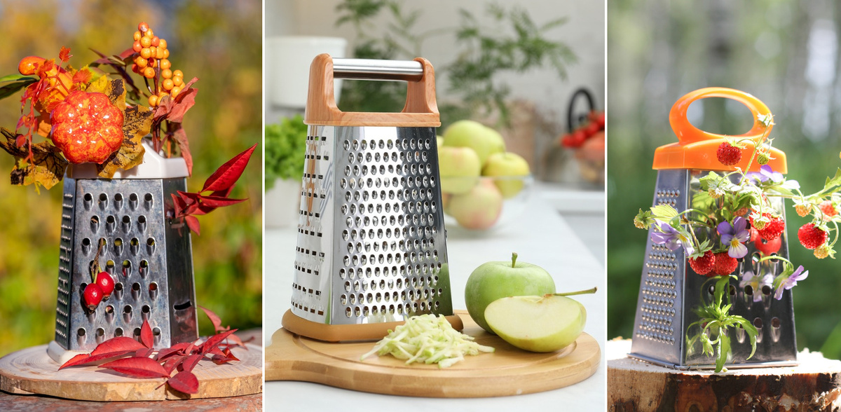 - Терка может служить не только как органайзер, но и как необычная ваза для цветочной композиции. Удалив ручку и добавив красивое стекло, можно создать дизайнерский акцент для интерьера.
