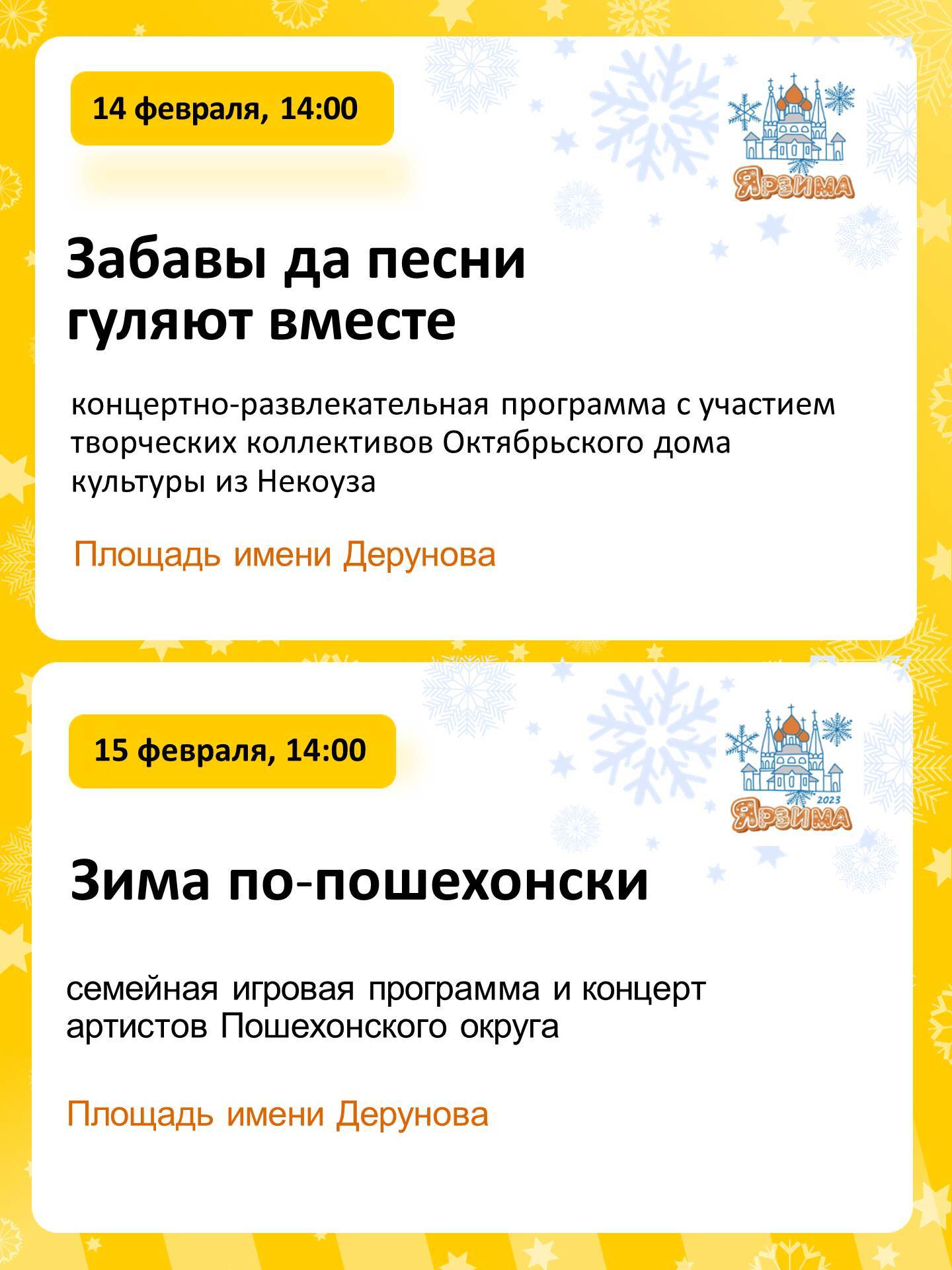 Фестиваль «ЯрЗима» продолжает радовать жителей и гостей Рыбинска яркими мероприятиями и теплыми эмоциями. На площади Дерунова пройдут выступления творческих коллективов из Некоуза и Пошехонья.