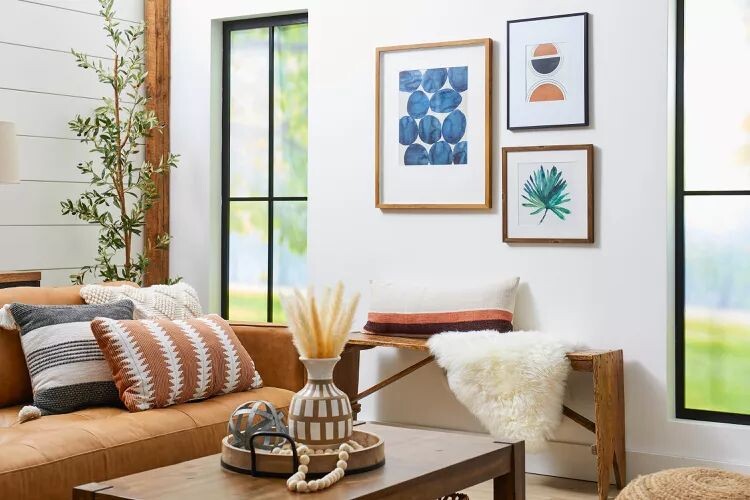 При планировании размещения картин, ключевым моментом остаётся принцип умеренности. Например, постарайтесь, чтобы произведение занимало около двух третей ширины дивана. При группировке работ между элементами необходимо оставлять пространство в 5-7 см.