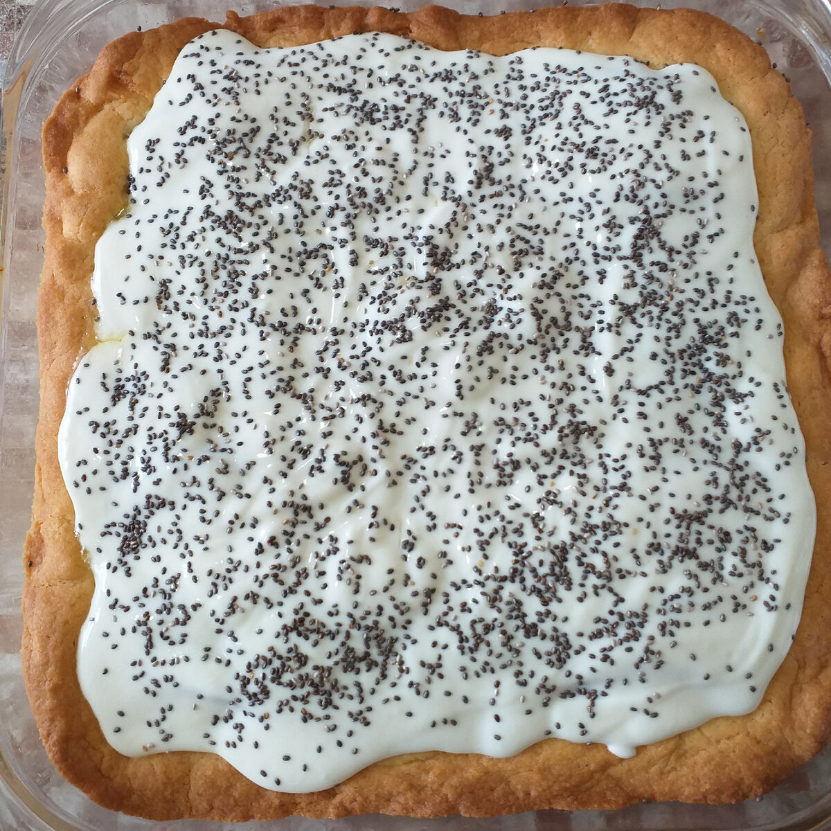 Пока пирог выпекается, приготовьте сметанный крем: просто смешайте сметану с сахарной пудрой (или сахаром) до однородной массы. Как только пирог будет готов, залейте его кремом, пока он еще горячий. Для дополнительного украшения можно посыпать семенами чиа или маком.