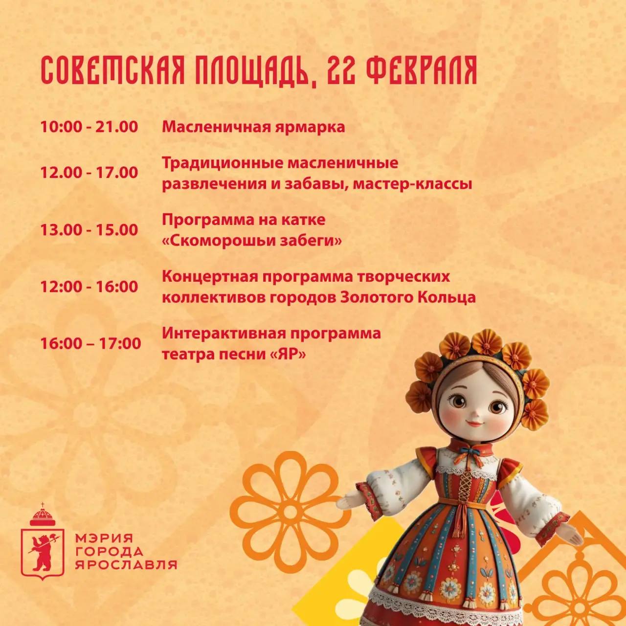 Завтра, 22 февраля, Ярославль проводит Главную Масленицу страны. На Советской площади выступят творческие коллективы городов Золотого кольца России. Вы сможете полакомиться блинами на масленичной ярмарке, стать участниками мастер-классов и конкурсов.