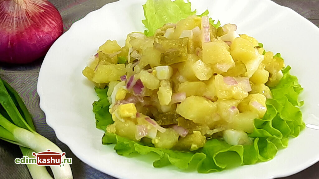 Когда картофель сварится, нарезать лук и соединить его с картофелем в салатнике. Добавьте процеженный огуречный рассол и картофельный отвар или бульон. Не стоит волноваться, если первое время кажется, что жидкости слишком много – большая её часть впитается в овощи. Накрыть салатник пленкой и оставить на 1 час для пропитки.