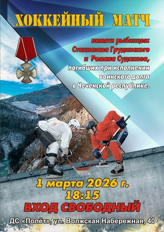 Вечером состоится хоккейный матч с участием сборных команд города, посвященный памяти героев-рыбинцев. Начало в 18:15 во ДС «Полет», вход свободный.