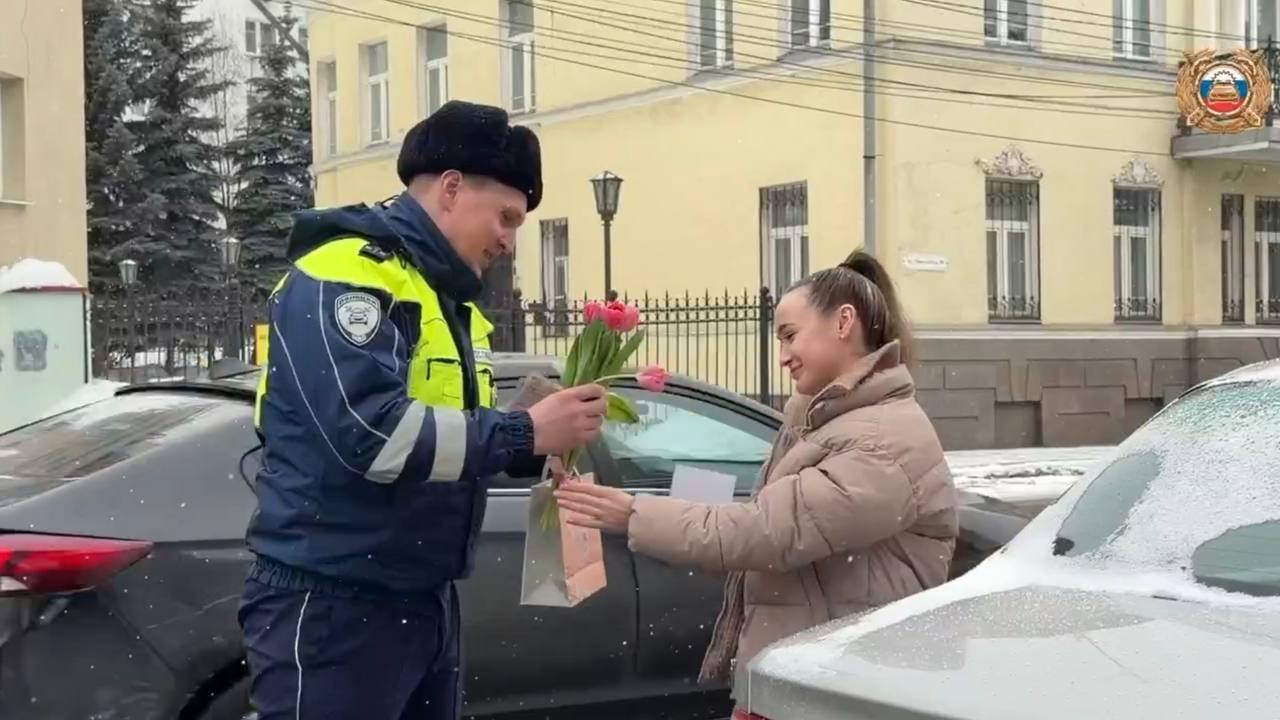 8 марта дорожные полицейские останавливали автоледи и просили документы на проверку. Затем в салоне патрульной машины подписывали постановление «О праздничном правонарушении» за управление автомобилем без цветов. Документ вручали вместе с букетом тюльпанов и сувенирами от Госавтоинспекции.