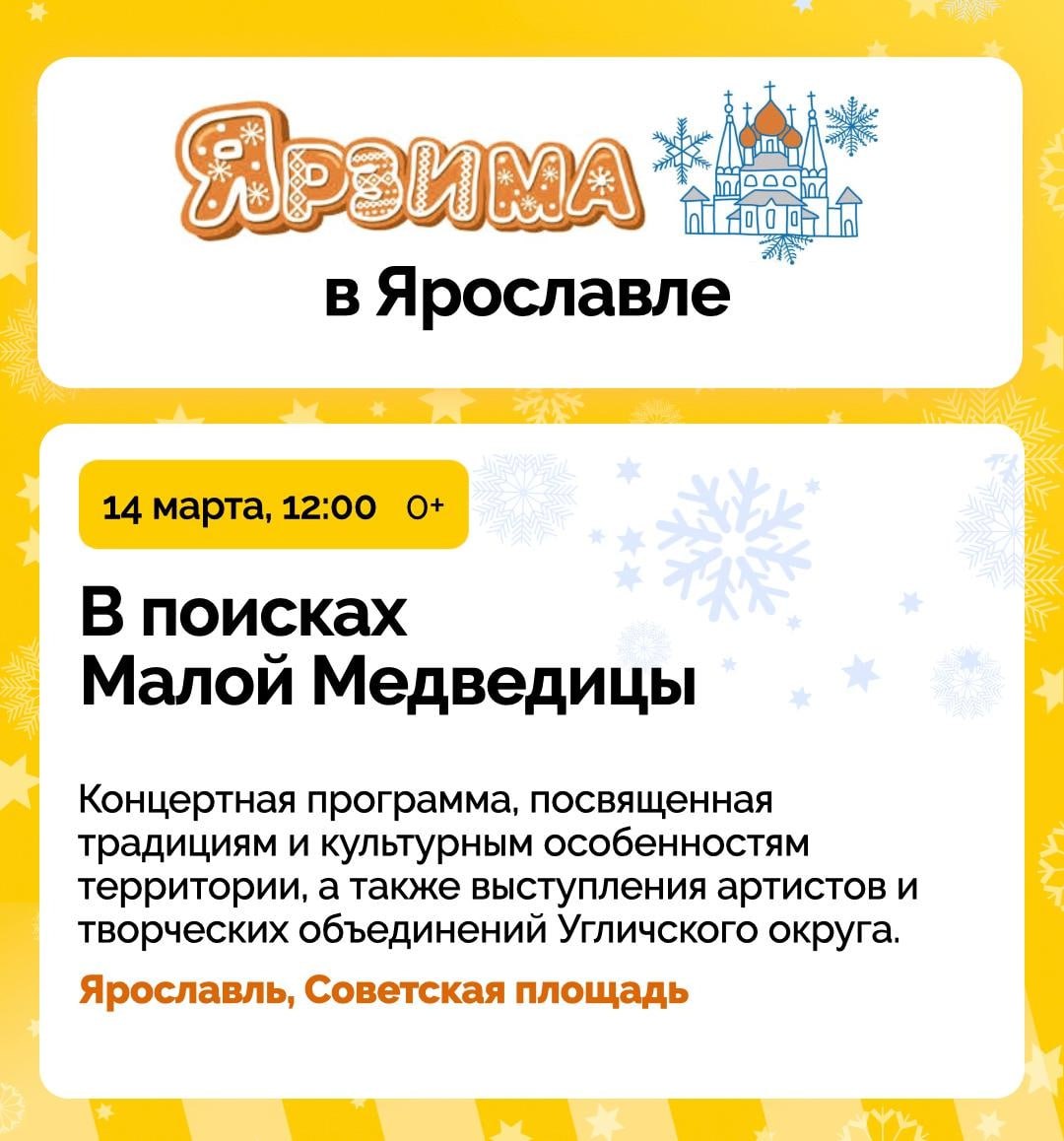 В субботу, 14 марта, свою программу «В поисках Малой Медведицы» представят творческие коллективы Угличского муниципального округа. Зрителей ждет концертная программа, посвященная традициям и культурным особенностям территории, а также выступления артистов и творческих объединений округа.