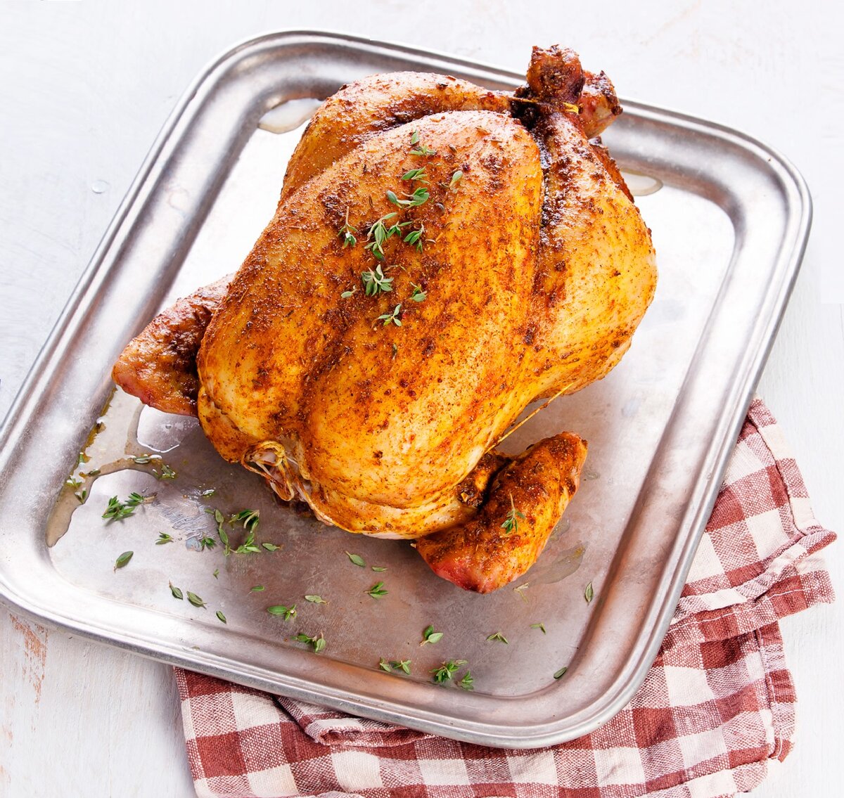 При запекании на противне курица будет готовиться в собственных соках, благодаря чему будет сочной и нежной. Для дополнительного эффекта, рекомендуется использовать специальный шприц, чтобы поливать мясо соусом во время готовки. Это придаст курице особенный вкус.