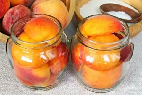 В подготовленные чистые банки укладываются половинки персиков. Крышки для этих банок нужно прокипятить в течение 7-10 минут для достижения максимальной стерильности.