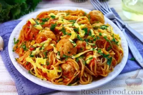 Блюдо, которое легко готовится в одной сковороде, станет настоящим спасением для занятых домохозяек. Спагетти варятся вместе с фрикадельками в насыщенном томатном соусе, а комбинация помидоров и томатного сока придаёт блюду яркий вид и кардинально обостряет его вкус.