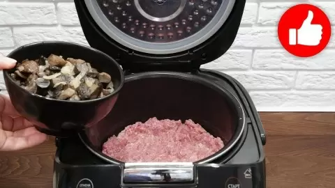 После обжаривания в смазанную маслом чашу выкладывается часть фарша, формируя стенки. На эту основу помещаются обжаренные грибы и лук, которые также немножко подсаливаются. Затем сверху закрывается оставшимся фаршем.