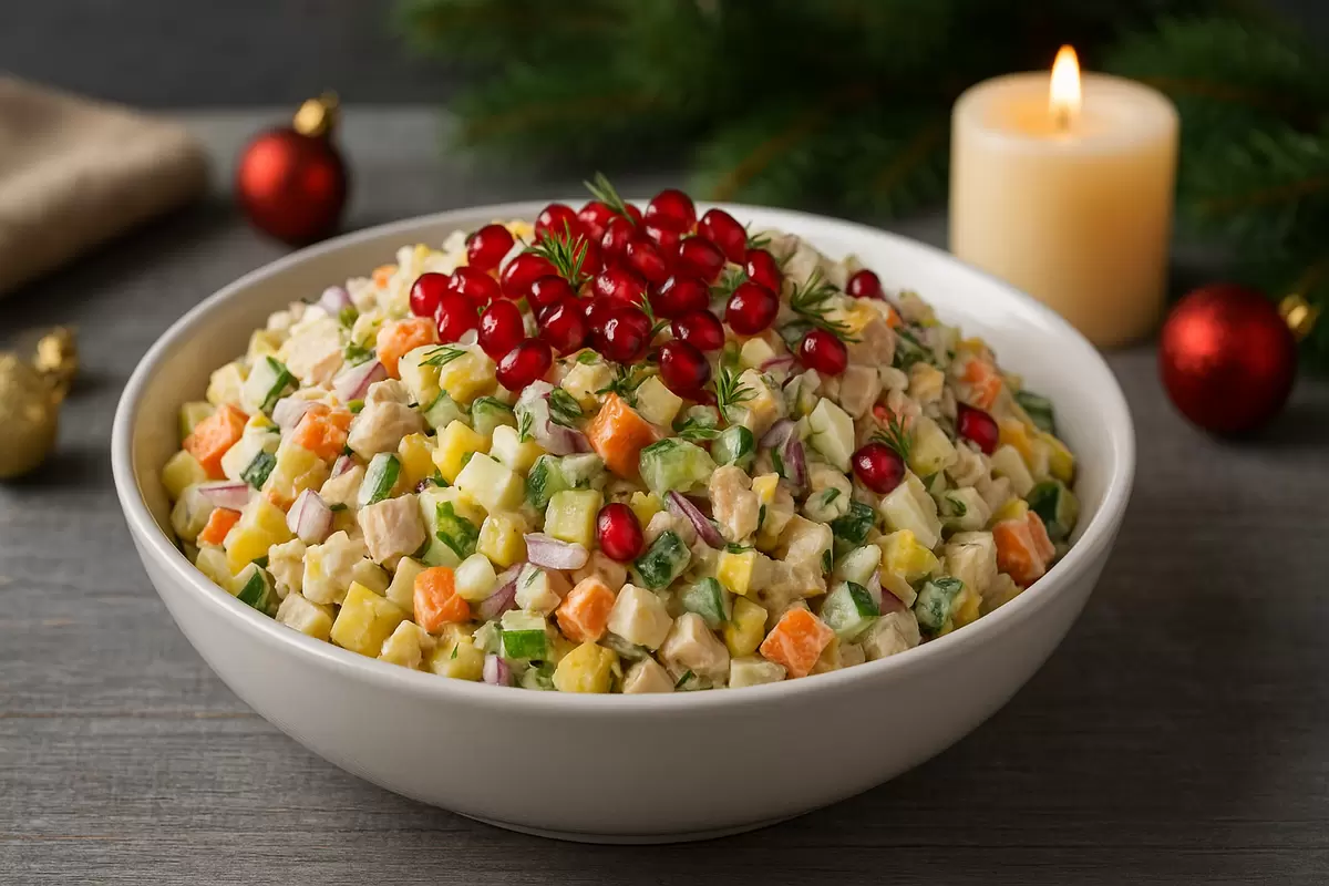 Красный лук нарезается полукольцами и маринуется в смеси уксуса, сахара и соли на 10 минут. Это придаст ему нежный вкус. Свежий огурец тоже нарезается кубиками, а гранат разбивается на зерна, оставляя несколько для украшения. Все подготовленные ингредиенты соединяются в большой миске, добавляется майонез и приправы. Салат тщательно перемешивается, после чего его раскладывают по красивым блюдам и посыпают гранатовыми зернами для яркости.