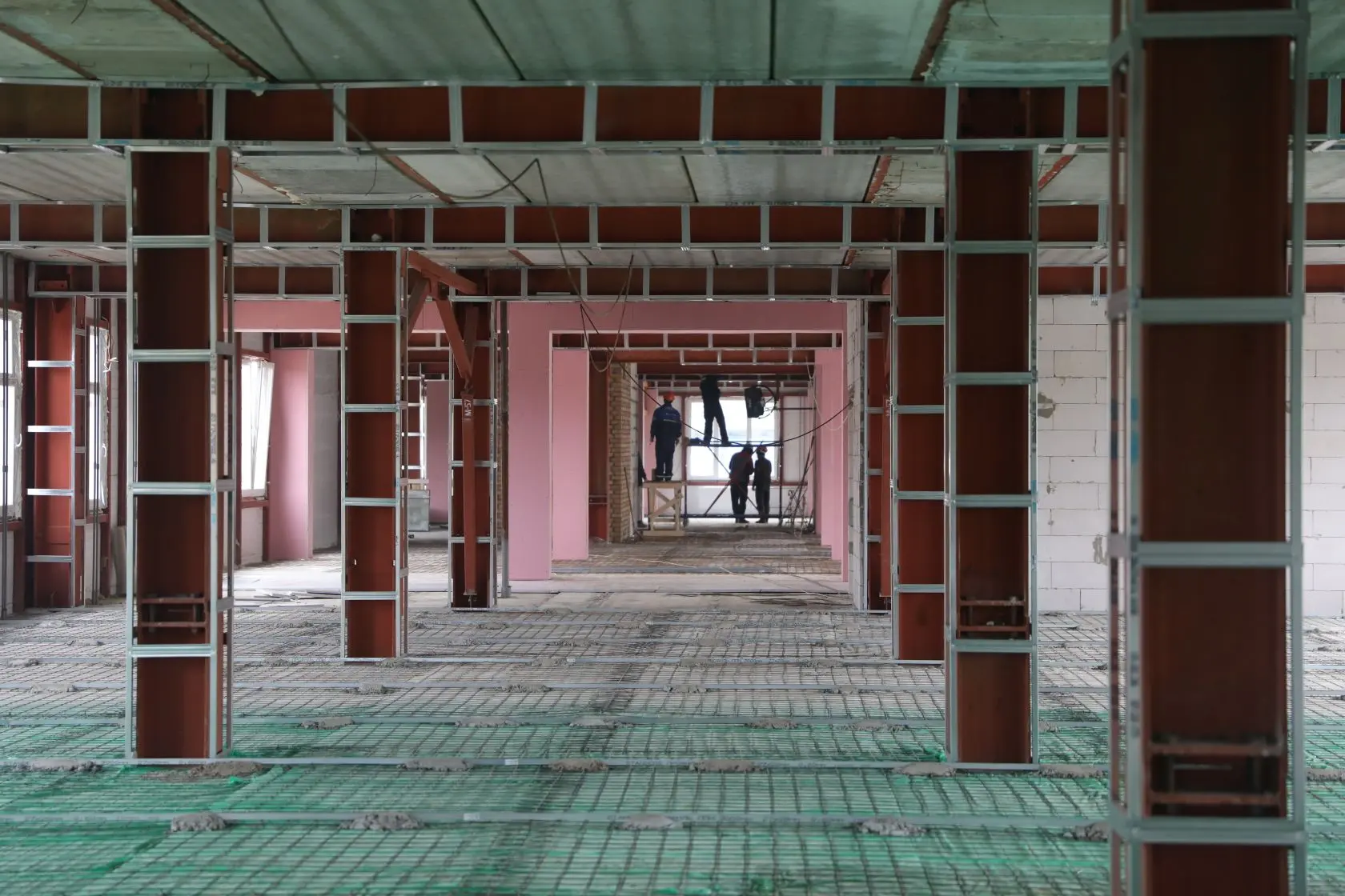 На сегодняшний день возведено двухэтажное здание, выполнена кровля, установлены окна и двери. Все инженерные коммуникации подключены к зданию и городским сетям. Подрядчик занимается внутренними работами. Темпы необходимо существенно наращивать.