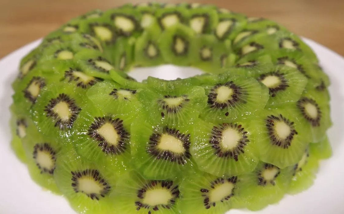 Киви укладываются по поверхности, придавая сходство с малахитом. Дополнительно можно использовать зелень, гранат, тонкие ломтики яблока или орехи. Перед подачей салат нужно настоять в холодильнике на 2–3 часа, чтобы он пропитался.