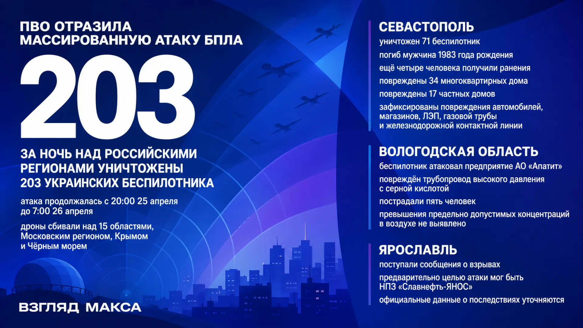 Минувшей ночью силы ПВО отразили одну из самых массированных атак украинских беспилотников по российским регионам. По данным Минобороны России, с 20:00 мск 25 апреля до 7:00 мск 26 апреля были перехвачены и уничтожены 203 БПЛА самолётного типа над 15 областями, Московским регионом, Крымом и акваторией Чёрного моря.