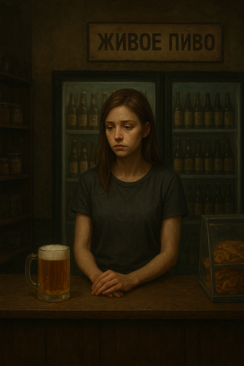 Собравшись, Вера направляется к своему магазину с вывеской "Живое пиво", мотивация к работе медленно уходит на второй план. За казалось бы привычными сценами: скрипящий ключ в замке, неуютный тусклый свет, продуктовые полки заполненные товарами, смущают её реалии снедаемого времени. В ожидании первых покупателей ее мысли уже рисуют картины жизни за пределами деревни — шумные улицы и цветные огни.